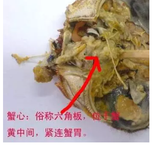 5、用勺柄将蟹身中间一个呈六角形的片状物挑出来,那是蟹心部分,丢弃。