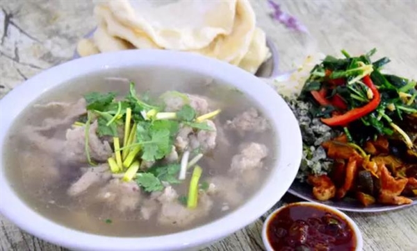 粉鸡是阜阳的一样经典美食。外观淡黄油亮,外表软绵,里边粉色红,品一口微辣略麻。这是用鲜美的鸡汤做汤底,放上葱姜,材料,下入调制好的粉鸡,最后放点小白菜、黑木耳、香菜,点入香油,一碗鲜嫩的粉鸡就出锅了。