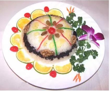 此菜历经千年,流传全国,色泽鲜艳美观,质软香甜,为春节必吃的佳肴。将蒸熟的糯米饭拌上糖和猪油,放点莲子、红枣、金橘脯、桂圆肉、蜜樱桃、蜜冬瓜、薏仁米、瓜子仁等果料,撒上红、绿梅丝做成,色香味美。