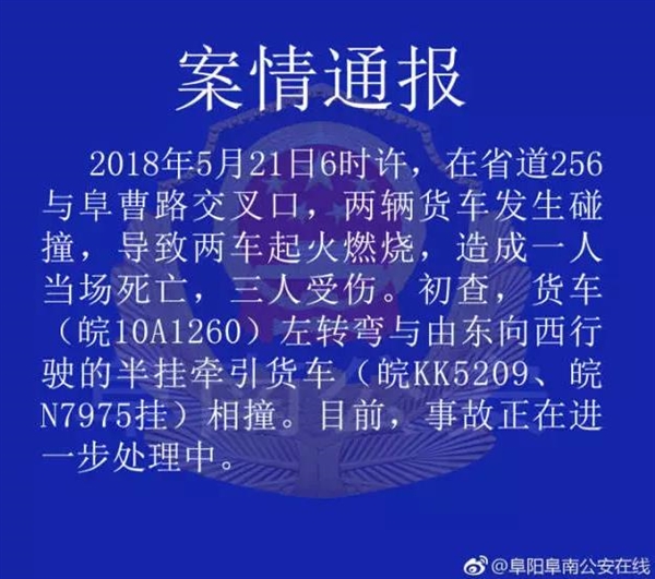 2018年5月21日早6时许,在省道256与阜曹路交叉口,一辆半挂货车与一辆货车相撞,致两车起火燃烧。造成1人当场死亡,3人受伤。初查,货车当时左转弯,与由东向西行驶的半挂货车相撞。目前,事故正在进一